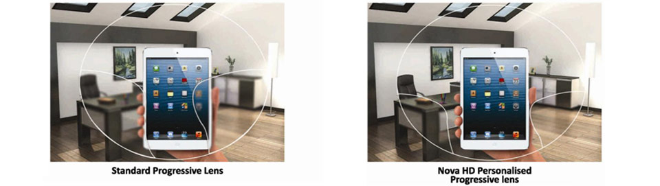 Nova HD provides optimal viewing comfort for every visual range and activity, with special attention on comfortable sharp focus in the 40cm-70cm range needed for viewing today’s handled devices like smart phones, tablets, laptops .The unique Ray Path Technology allows natural head movement to view images and fine text of the devices. It offers quick appearance & upto 20% more addition power than standard progressive lenses in the 40cm-70cm vision range. Nova HD offers, upto 20% wider reading area with full addition and 20% wider intermediate area, thereby offering extra viewing comfort for digital devices & easy transitions between lens zones.